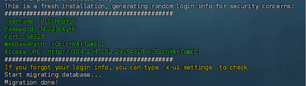 然后就安装完成了,下面会出现3x-ui面板URL地址、设置的端口、随机生成的用户登录信息。建议将信息保存下来,后面登录用。