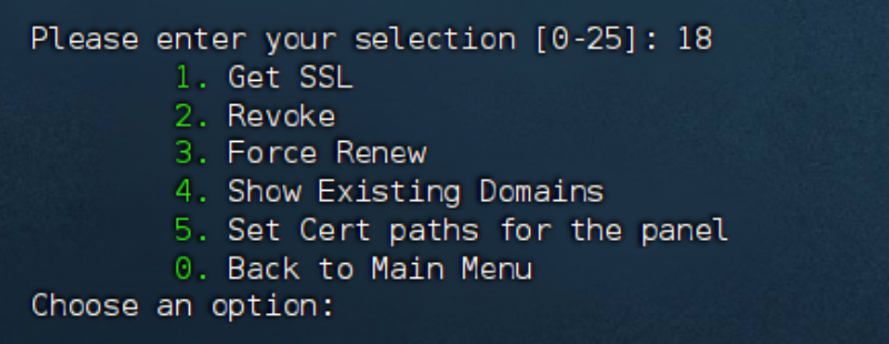 输入数字 “18” SSL 证书管理,接下来输入“1” Get SSL,开始申请证书,注意:这里需要放行80端口。