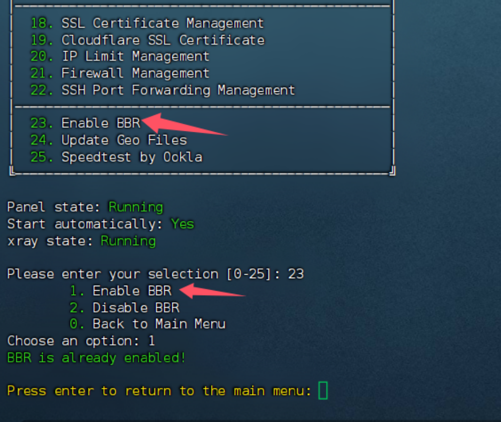 SSH 里面可以输入x-ui操作命令,输入“23” 启用 BBR ,根据提示再输入1,BBR就启用了